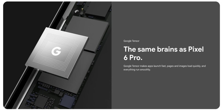 Pixel 6a 採用了大哥 Pixel 6 同款設計語言,兩款手機相似程度極高,同時 Google 提供了三種配色,分別是黑色、白色、以及綠色。芯片方面同樣也是大哥同款自研 Tensor 芯片。