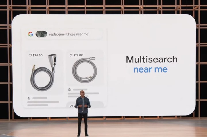 未來,Google 搜索引入 Multisearch near me 功能,説罷 Pichai 就展示了這項功能:拍一張水龍頭的照片,再加上一句搜索語:維修這東西的零件,最後用「near me」所結尾,搜索引擎就會在地圖上標記出附近能買到這個零件的商店。