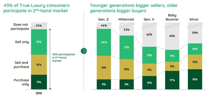 2019 年 10 月,波士頓諮詢集團報告指出,越年輕的消費者對二手奢侈品市場參與度越高,54% 的 Z 世代和 48% 的千禧一代進行過二手奢侈品交易。