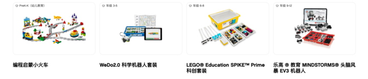 為幼兒教育準備的編程啟蒙小火車套裝、適合 3 至 5 年級的 WeDo2.0 科學機器人套裝、適合初中學生的LEGO SPIKE Prime 科創套裝、適合高中學生的LEGO頭腦風暴 EV3 機器人套裝。其中LEGO頭腦風暴編程機器人還是全球知名的國際奧利匹克機器人大賽最常見的參賽硬件平台。
