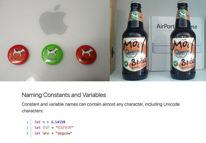 ▲ 蘋果為「奶牛狗」製作的徽章,啤酒標籤,以及隱藏在代碼中的彩蛋,讓它成為了一個非官方的吉祥物