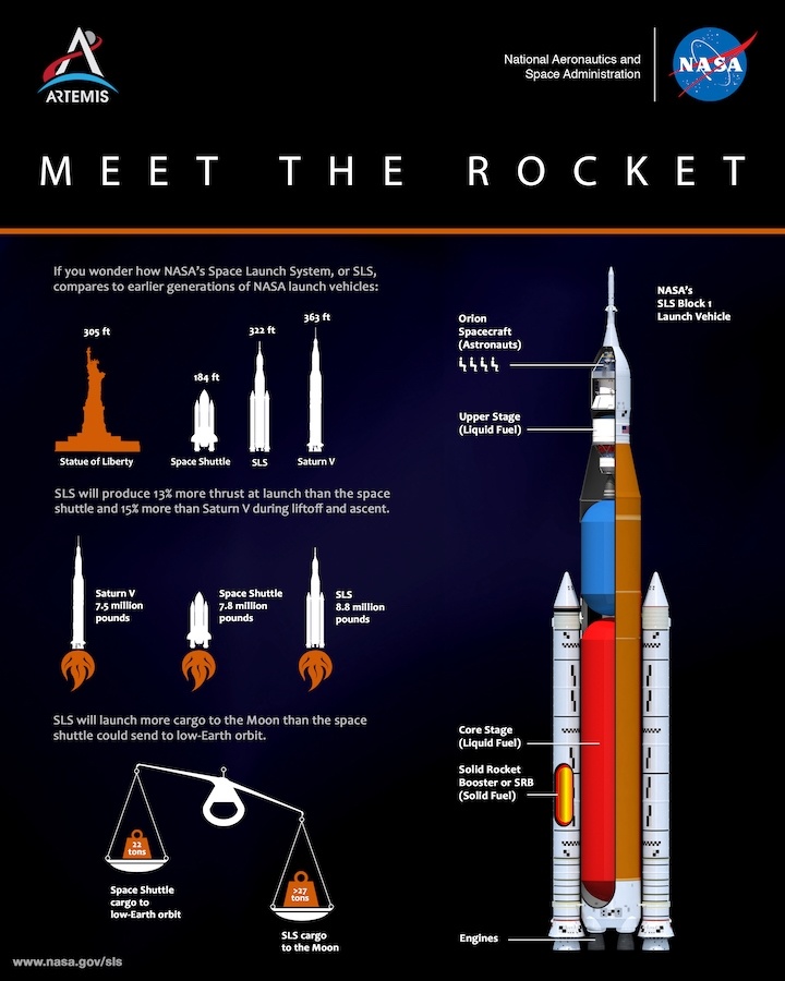 航天器與巨大的 SLS 火箭,高度達到 322 英尺(約 98.14 米)、重量為 350 萬磅(約 1587.57 噸)。從 2011 年就開始的 SLS 開發工程, 整合了 1981 年至 2011 年間運行的航天飛機的主要部件,進行了硬件升級,並使用了新的工具和製造技術。但 SLS 目前不能重複使用,所以每次任務都需要新的火箭,因此每次發射成本高達 41 億美元 。