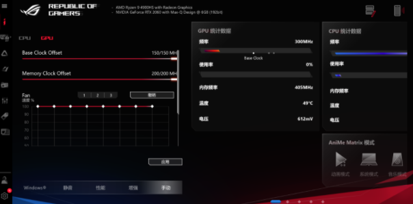 另外值得一提的是,不僅 CPU 性能強勁,幻 14 身上的 RTX 2060 Max-Q 也是可以超頻的爆種版本。用户進入「奧創中心」調至手動模式,即可對相關參數和風扇轉速進行自主設置。