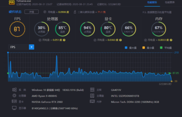 結果顯示,遊戲全程的平均幀數為 87 幀,整體波動幅度不大。且得益於屏幕的 Adaptive Sync