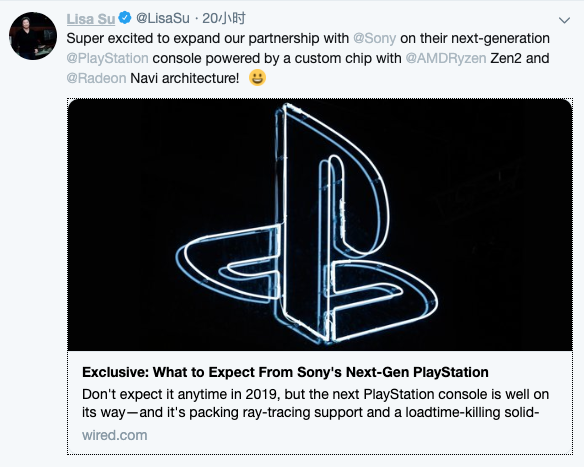 有趣的是,在 Wired 的報道發表後,AMD CEO 在 Twitter 也證實了新一代主機將會繼續使用 AMD 芯片。