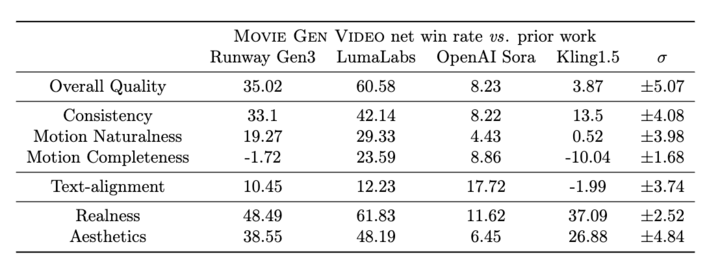 結果顯示,Movie Gen Video 整體評估效果上顯著優於 Runway Gen3 和 LumaLabs,對 OpenAI Sora 有輕微的優勢,與可靈 1.5 相當。