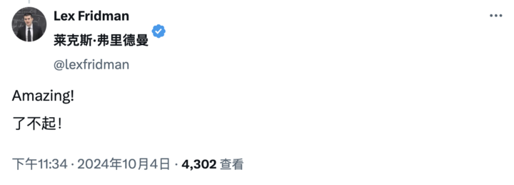 看完演示 demo 的 Lex Fridman 言簡意賅地表達了讚歎。