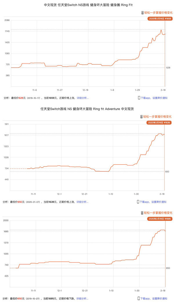 沒想到的是,1 月底的疫情影響下,人們對於室內運動的需求也大幅增長,這間接帶火了和健身相關的遊戲。此時健身環出現了第二次漲價,且增長曲線更為明顯,定價一路衝破 1600 元大關。