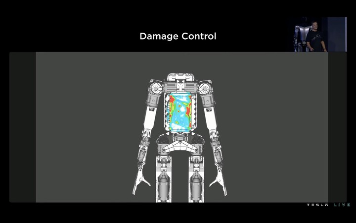 與汽車上的吸能原理相同,Tesla 也為擎天柱加入了一塊吸能區,在其跌倒時,胸前的吸能區能夠有效控制損傷範圍,防止手臂和頭部受損。