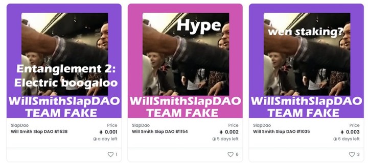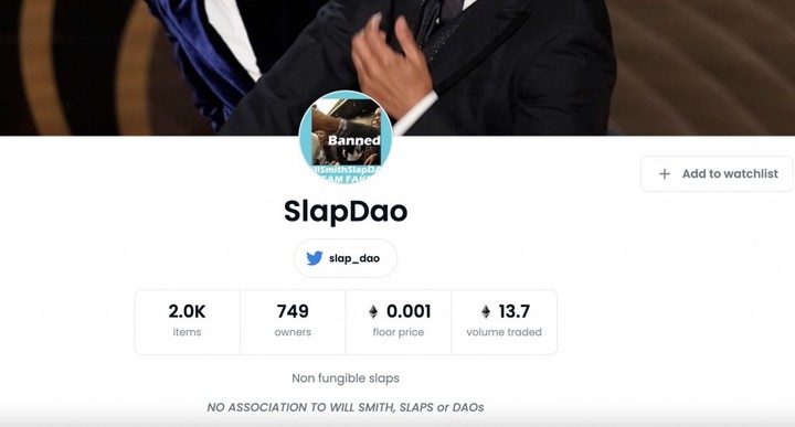 在 NFT 交易平台 OpenSea 上,一個名為「Slap DAO」的賬號已經發布了一系列命名為「Will Smith Slap Dao」的 NFT 作品,這個系列目前共有近 2000 個項目。