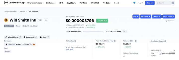 除了 NFT ,「幣圈」也是動作迅速,名為「Will Smith Inu」的加密貨幣推出後便迅速上漲,CoinMarketCap 網站上顯示它的價格上漲超過了 3700% ,不過價格並不算高,目前是 0.000003796 美元。