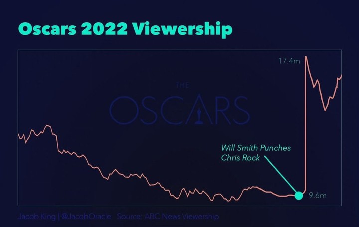 Will Smith 的打人事件,讓許多事物都達到了新高峯,比如看奧斯卡的觀眾人數、人們的娛樂談資,各類新聞報道與分析文章,甚至事件的另一位當事人 Chris Rock 之後的脱口秀門票,價格和銷量都因此大漲。
