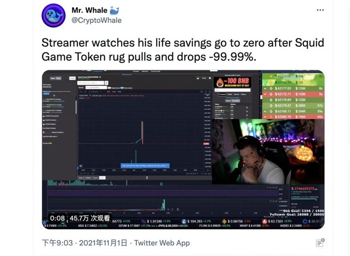 比如之前大火的 Netflix 電視劇《魷魚遊戲》,在火爆全球后,CoinMarketCap 上也迅速出現了相關的加密貨幣,甚至一週漲幅接近 310,000%。然而不久之後又迅速崩盤,從 38.27 美元跌至 0.0030 美元。