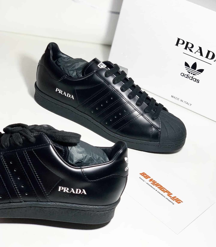 全皮革的 adidas SUPERSTAR,在聚光燈下盡顯奢華,鞋舌部分亦有 PRADA 與 MILANO 的字樣呈現聯名特點。