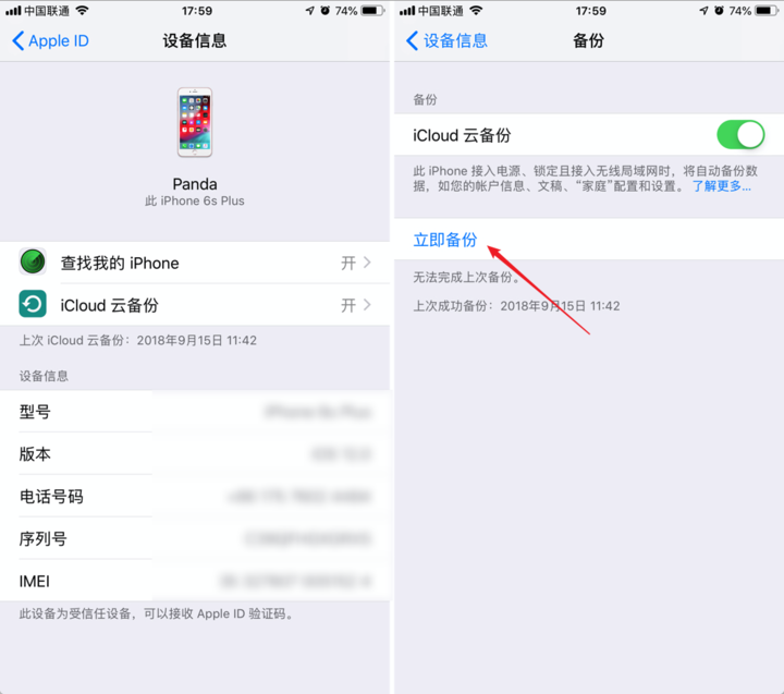 從「設置」頂部進入個人賬號中心,在設備中點擊你現在的手機,進入「iCloud 雲備份」點擊「立即備份」即可。