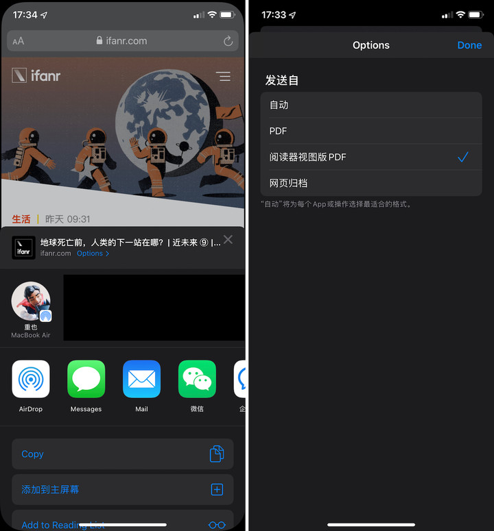在 Safari 瀏覽器中,網頁分享功能提供了兩種 PDF 樣式以及網頁歸檔等模式可選,當然你也可以設置「自動」,讓系統根據對象選擇最合適的分享方式。