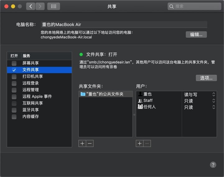 首先,你需要設置一個共享文件夾。在 macOS 上可以這樣操作:打開「系統偏好設置」>「共享」> 選擇「文件共享」> 勾選「使用 SMB 來共享文件和文件夾」,之後便會生成一個固定的訪問地址。