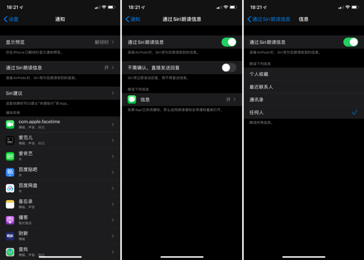在連接 AirPods 的情況下即可開啟該選項,通過「設置」>「通知」>「通過 Siri 朗讀信息」可以進行更進一步的設置。