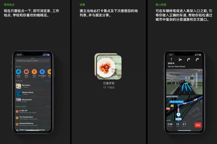 ▲蘋果地圖新增的路口視圖、收藏等功能,圖片來源:Apple