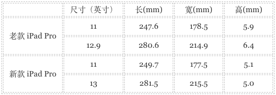 另外,新款 iPad Pro 的厚度也比上代薄了 10%~15%,有 11/13 英寸兩款可選,並且保留了 Wi-Fi 與蜂窩兩個版本。
