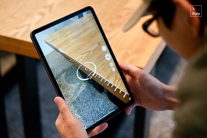 以官方應用「測距儀」為例,使用舊款 iPad Pro 或者 iPhone 時,由於設備使用攝像頭圖像感知,在測量前,你總需要花一些時間尋找特定的平面,不僅在黑暗環境下無法使用,還經常會出現虛擬物體與真實物體重疊的穿幫效果,而激光雷達加持下的新 iPad Pro 不僅不懼暗光打開即用,還實現了非常精準和智能的探測。