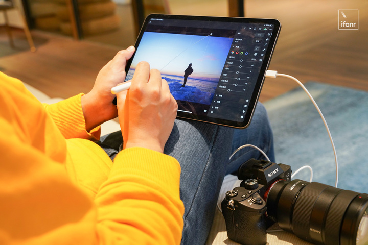 但 iPad Pro 的出現後,這一套流程縮短為:直接用 Type-C 相機連接 iPad Pro 導入照片,打開 Lightroom cc 後期導出到相冊,甚至直接備份到雲盤。