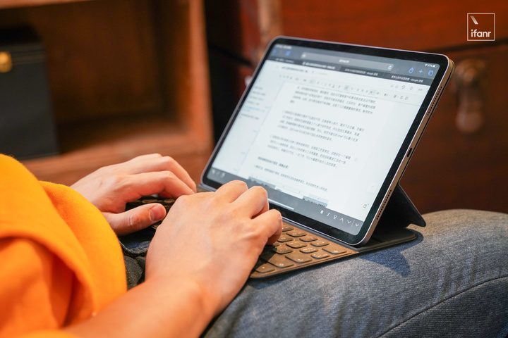 無論是無級調整屏幕角度、剪刀式鍵盤、抑或自帶 USB-C 接口,這個外設都讓 iPad Pro 更像一台筆記本電腦。