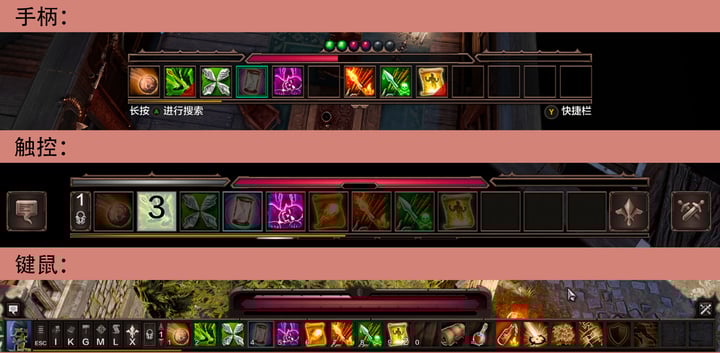 調整視角、移動、鎖定對象、攻擊等操作,與手柄上的按鍵一一對應,遊戲界面頂欄的按鈕統統集合到頂部左鍵上,按下後再用搖桿選擇次級界面,這下幾乎可以把 iPad 當成一台小型主機去玩了。