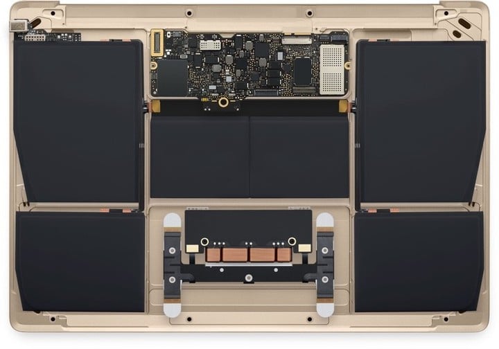 同樣的情況也出現在 2015 年的 12 寸 Retina MacBook 上。從工業設計的角度來看,這台 A4 紙大小的全金屬機身小筆記本可以説是 MacBook 有史以來最驚豔的一代,內部工藝更是貨真價實的「tech porn」: