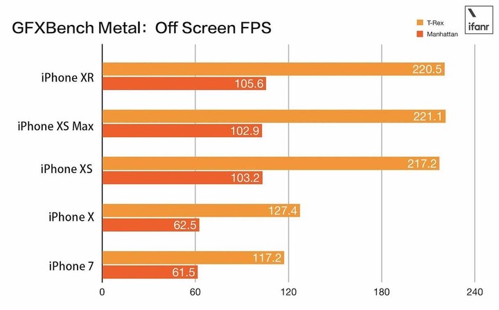 但 GPU 的測試差距則會稍大一些。根據我們實測發現,GFXBench 中的 Aztec Ruins 等場景下,iPhone XR 的 OnScreen 分數會明顯比 iPhone XS Max 的高 20 幀左右。考慮到 XR 較低的屏幕分辨率,相同芯片基礎下自然壓力也小很多,所以分數會更高些。