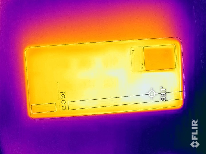 直接上硬菜,試玩《原神》30 分鐘後,iQOO 8 Pro 整個機身微熱,熱源主要集中在上部拇指位,背部則是攝像頭附近,機身温度來到 38℃,並不燙。
