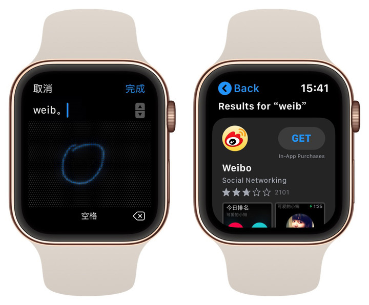 我在搜索框中輸出「Weibo」能搜索出微博客户端的 app,但從介紹裏看,這個程序其實只是過去 iOS 傳輸到 watchOS 的一個通知分身而已,並非是完全獨立的程序。