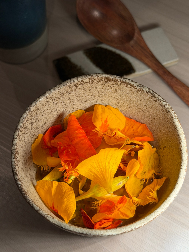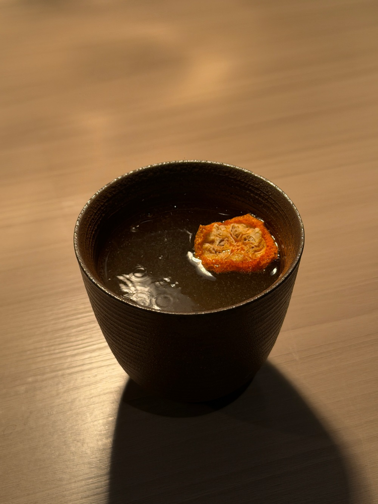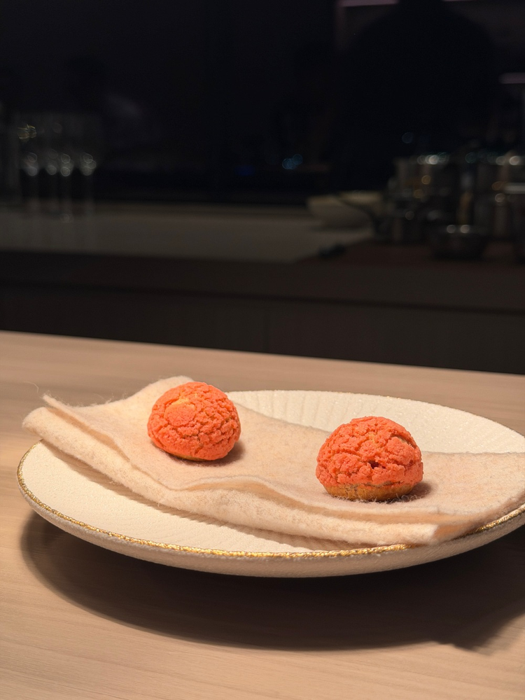 緊接著的 「Äggost — 番茄茶碗蒸」 則展現了極致的層次感:清透的番茄汁基底配上日本赤貝與三文魚籽,金蓮花的辛香讓鮮甜味瞬間在舌尖爆發。