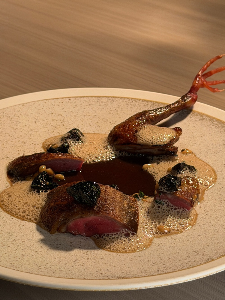 主菜提供兩種選擇,喜歡野味的賓客可選 「Stegte Duer — 烤乳鴿」,櫻桃木的煙燻香氣與雞血醬汁的微甜相得益彰,冬菇泡沫與松子仁增添了大地氣息。