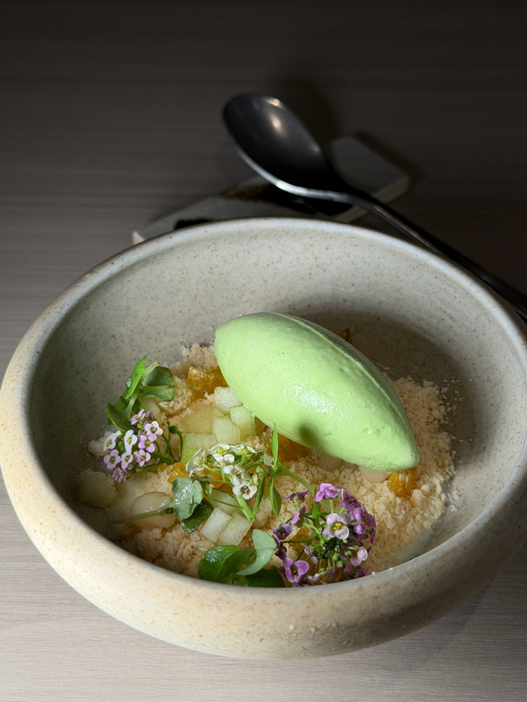 壓軸甜點 「Salaatti — 青檸奶凍、羅勒雪糕」 以清爽沙律為構思,酸甜爽口。伴隨柚子洋甘菊茶凍與葡萄蜜調製的 「Drue」,為整場味覺旅程畫下完美的句號。