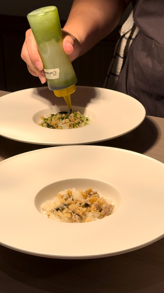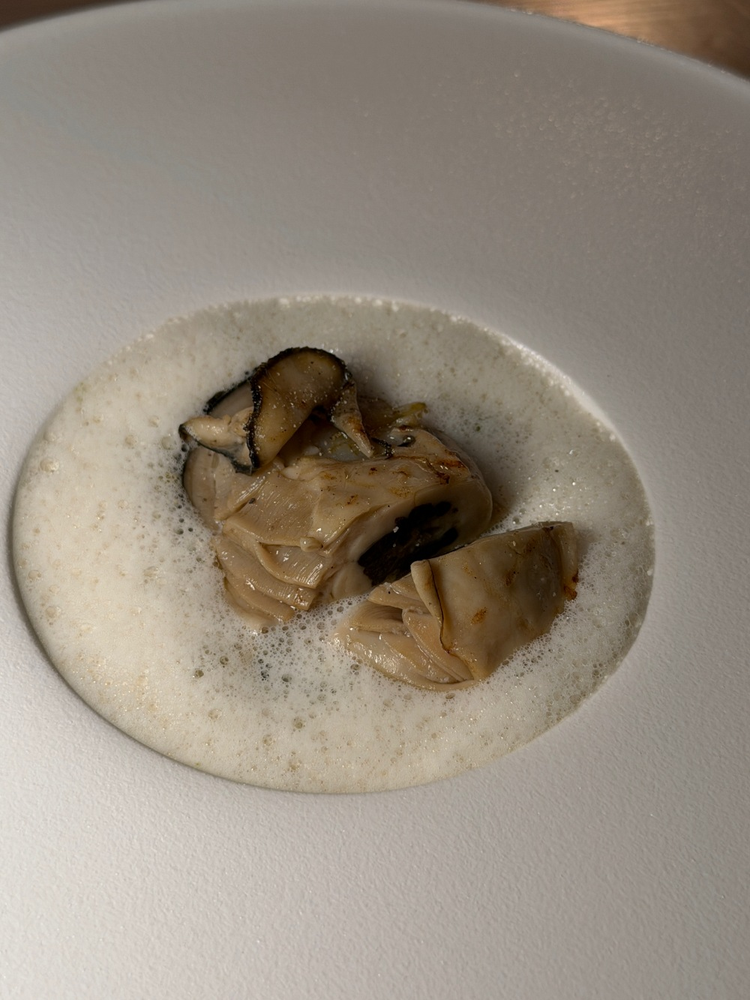 前菜部分,「Kornsgröt — 蠔仔粥」 無疑是主廚對香港情懷的致敬。炭火烤香再低溫油封的生蠔,與融合壽司醋飯的大麥粥碰撞,配上發酵草莓與紅紫蘇特製的 「Jordbær」,果酸與鹹鮮的對位,將生蠔的靈魂昇華。