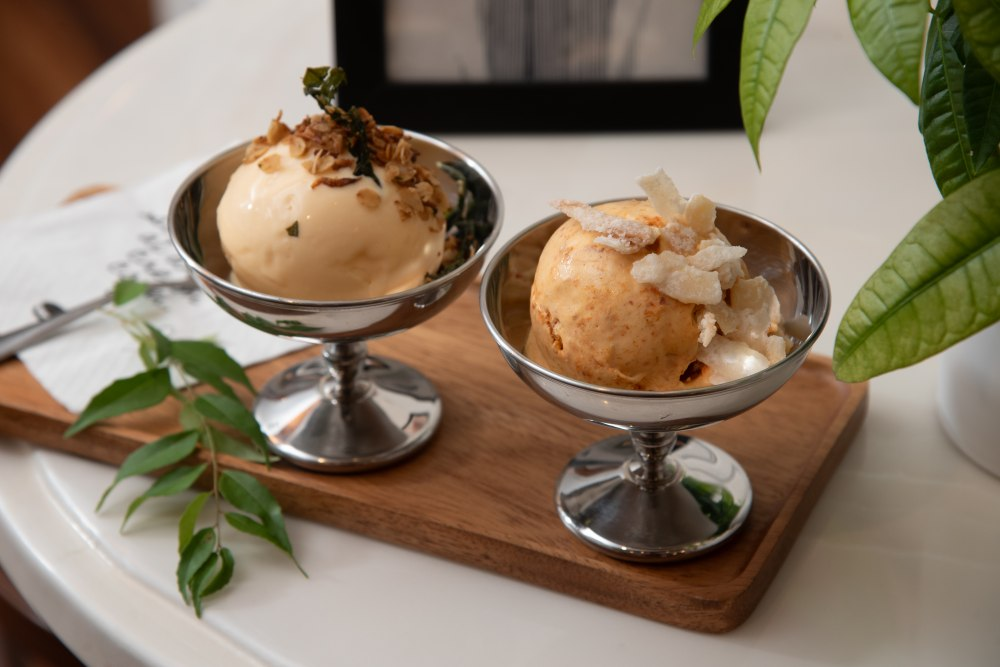 喇沙雪糕則是更大膽的嘗試,將濃郁香辣的喇沙湯底轉化為冰涼甜品。製作過程使用南薑、薑黃、檸檬草、喇沙葉和乾蝦調製自家叻沙醬,以奶油椰漿為基底融合所有香料,最後撒上糖椰片——這種新年才常見的傳統小食,與喇沙的搭配出人意表地和諧。