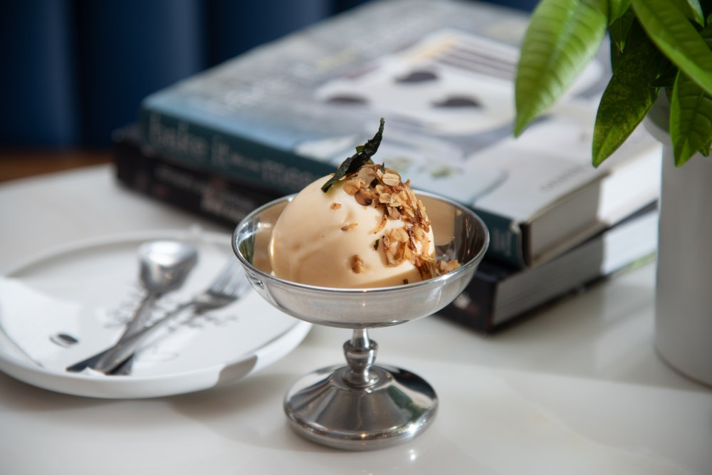 鹹蛋黃雪糕將傳統粵菜精髓重新演繹,先將鹹蛋黃蒸熟與鮮奶混合至滑順質感,創造出甜中帶鹹的獨特層次。最精彩的是表面點綴——從新加坡帶回的香脆穀物,配上咖喱葉與牛油炒至金黃,一口咬下既有奶香又有香料的複雜風味。