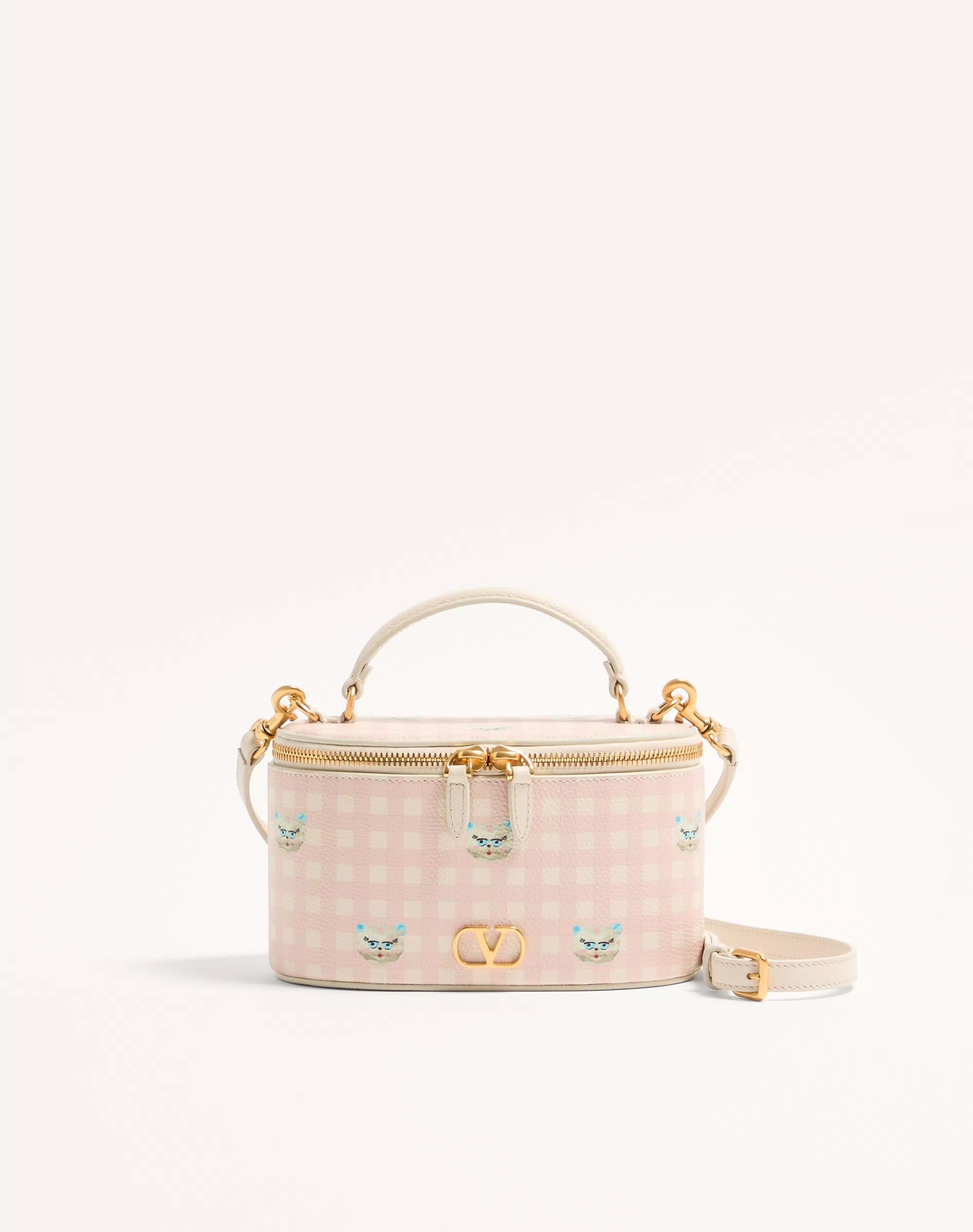 由Alessandro Michele 設計的Valentino VLogo Signature 迷你化妝包,採用粒面小牛皮製成,飾有 Le Chat De La Maison Vichy 圖案,非常可愛。